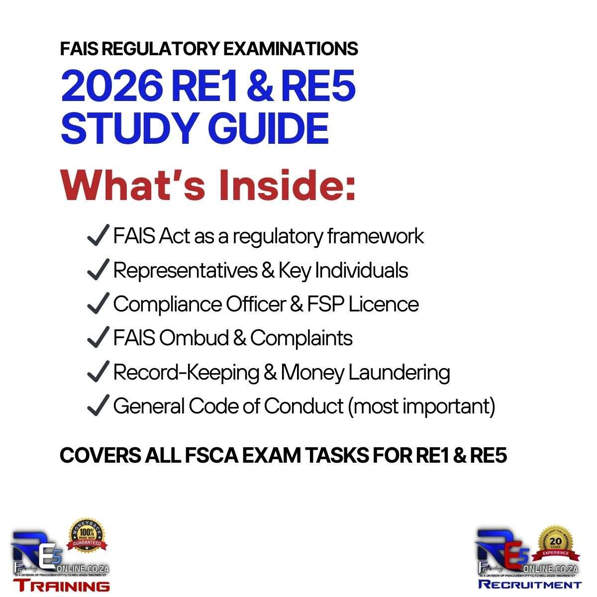 Writing your RE5 (Representative) or RE1 (Key Individual) exam in 2026 and need one clear, structured guide instead of juggling multiple documents? Our 2026 RE1 & RE5 Study Guide brings all the essential FAIS content together in 12 focused chapters, written in plain language and aligned with the current RE1 and RE5 exam tasks.